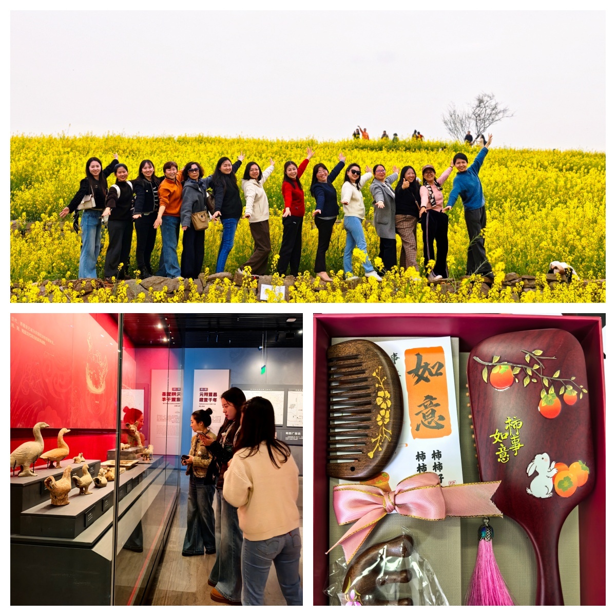 走出展馆,大家投身一片金灿灿的油菜花海里。有的三两结伴漫步赏景,有的围坐闲谈、增进感情,有的以花海和古建筑为背景,开启趣味打卡模式?;疃詈?,山地所工会还为每位女职工精心准备了节日伴手礼。