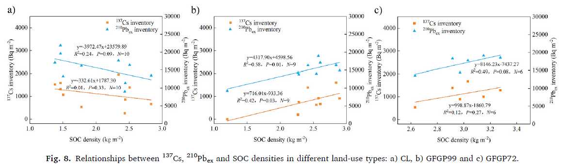 不同样地中137Cs、210Pbex与SOC的关系:a)耕地;b)1999年退耕还林样地;c)1972年退耕还林样地