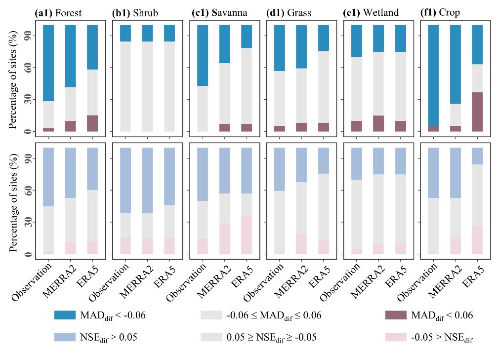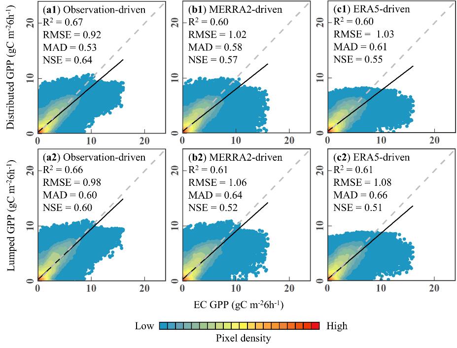 ????为解决这一问题,成都山地所谢馨瑶副研究员团队以全球194个FLUXNET站点为样本,结合再分析产品(MERRA2和ERA5)与站点观测数据,深入探讨了气候数据引起的时间尺度不确定性。研究发现,在1小时时间尺度下,由再分析数据驱动的GPP与站点观测数据之间的相关性较弱,而观测数据驱动的GPP则表现出更强的相关性。进一步分析发现,辐射引起的不确定性显著高于温度和VPD带来的不确定性。在6小时时间尺度下,集总式GPP(基于6小时气候数据建模)表现较差,而分布式GPP(基于1小时气候数据建模)与站点数据更加吻合(MAD降低0.06 gC m-26h-1,NSE提高0.05)。这表明时间分辨率对估算精度有显著影响,且忽略时间波动会加剧GPP估算误差。通过评估气候波动引起的时间尺度误差,本研究为理解全球气候变化对陆地生态系统碳循环的影响提供了新的研究框架。