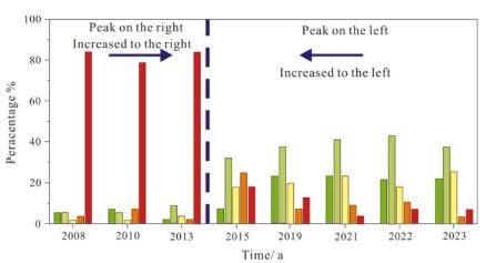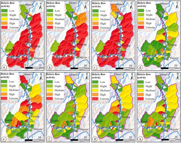 ????针对该问题,成都山地所熊江助理研究员、陈华勇研究员联合成都理工大学唐川教授及合作者们综合考虑了水文气象、地形地貌、物源发育对汶川地震震中区长期输沙效应与泥石流活动性演变互?;瓶沽顺て诠鄄庥敕治?。研究表明,震初5年,岸坡及沟道内固体物质结构松散、粘聚力较低,极端暴雨极易导致固体物质起动补给泥石流,导致该时期大部分山区流域具有极高和高泥石流活动性。然而,随着松散堆积体压实固结及表面粗化过程加剧,泥沙供给能力显著降低,泥石流活动性逐渐由极高和高分别以?0.06 yr?1 和 ?0.02 yr?1的速率向中等、低和极低活动性演变。震后受泥沙供给量逐渐减少,泥石流活动性整体以幂律规律衰减,且将持续近50年后才能恢复至震前水平。目前,汶川地震震中区约59.32%的流域泥石流活动性已经恢复至低水平,但仍有近10%流域具有极高和高泥石流活动性,且主要集中在草坡以北区域。本研究不仅提出了强震扰动区泥石流活动性时空演变监方法,更为理解同类型强震扰动区泥石流活动性长期动态演变规律提供了理论参考。