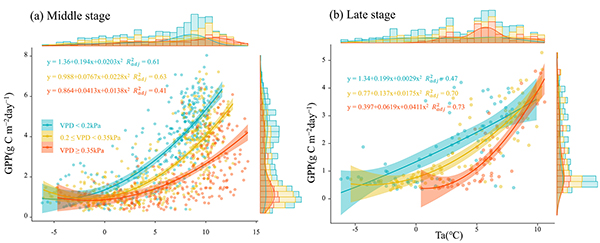 生长季中后期不同饱和水汽压差条件下总初级生产力与气温的关系