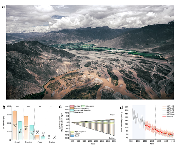 ????为解决上述科学问题,成都山地所西藏生态环境创新团队通过长期积累,建立冻土标本库和土壤磷数据集,系统评估了1980s和2020s的冻土磷密度与储量变化和历史轨迹。自主研发了基于质量平衡原理的生态系统磷流模型(MPFE),开展SSP1-RCP2.6、SSP2-RCP4.5、SSP3-RCP7.0和SSP5-RCP8.5等情景预测。研究发现,青藏高原冻土表层土壤(0-30 cm)磷密度从1980s的1583.8 ± 67.6 kg P ha-1下降至2020s的1046.4 ± 32.0 kg P ha-1。土壤磷储量减少了125.1 Tg P,下降幅度为36.1%。土壤磷年均流失量达3.5 Tg P yr-1,相当于中国农田年磷肥施用量的83%。水蚀贡献了总磷输出的82.3%,远高于风蚀(4.0%)和植物吸收(13.7%)的贡献率。青藏高原生态工程实施减少磷损失量0.29 Tg P。到本世纪末,表层土壤磷储量预期仅为1980s的20.3%,冻土磷素快速流失导致氮磷失衡加剧植物磷限制,增加了水环境富营养化风险并产生广域效应。该研究为冻土区生物地球化学循环提供了理论和方法,为青藏高原生态环境?;ぬ峁┝酥匾目萍贾С拧?/p>