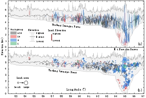????雅鲁藏布江位于印度板块和欧亚板块碰撞带,是全球地质构造和地形地貌最为复杂的地区之一,同时,强烈的隆升和剥蚀作用使得雅鲁藏布江流域成为地表起伏最为剧烈的区域之一,岩体破碎、地震频发,这些使得雅鲁藏布江流域成为滑坡的易发区、高发区,但该流域长期以来缺乏系统的滑坡研究。因此,分析该流域大型滑坡空间分异格局特征及驱动控制要素,可以为该流域滑坡和地貌演化研究提供科学依据。为此,成都山地所苏立君研究员团队,通过系统遥感解译与野外调查分析,对该科学问题展开研究。