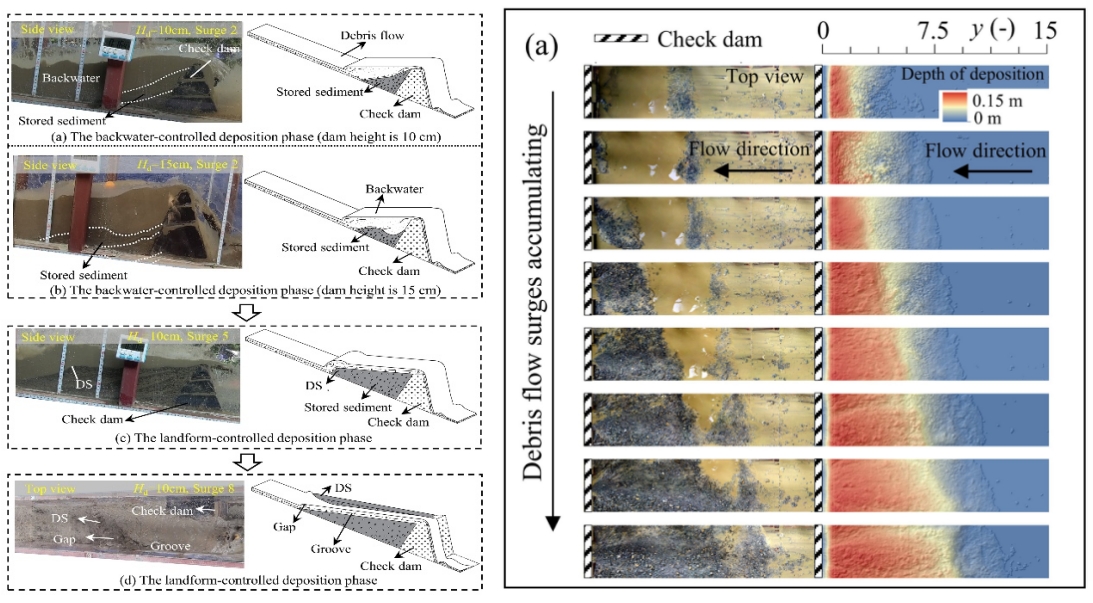 ????针对上述问题,中国科学院成都山地灾害与环境研究所陈剑刚研究员团队联合云南东川泥石流观测研究站,通过多阵次泥石流物理模型实验,开展了拦砂坝库区淤积地貌演化规律及其对泥沙拦淤效率的调控机制研究。研究表明,拦砂坝建成初期(回淤控制阶段),坝后回淤效应显著,拦淤过程受水力消能作用影响,拦淤效率最高,拦砂率约80%;随着淤积的发展,淤积体纵坡等地貌特征逐渐发挥调控作用(地貌控制阶段),拦淤作用逐渐衰减,拦砂率以约10%每淤积单位的速率衰减;当拦砂坝淤满,其顶部逐渐形成稳定过流通道(准平衡阶段),拦砂率降至接近零点。进一步建立了基于物理过程的拦淤量与拦砂率演变的参数化模型。