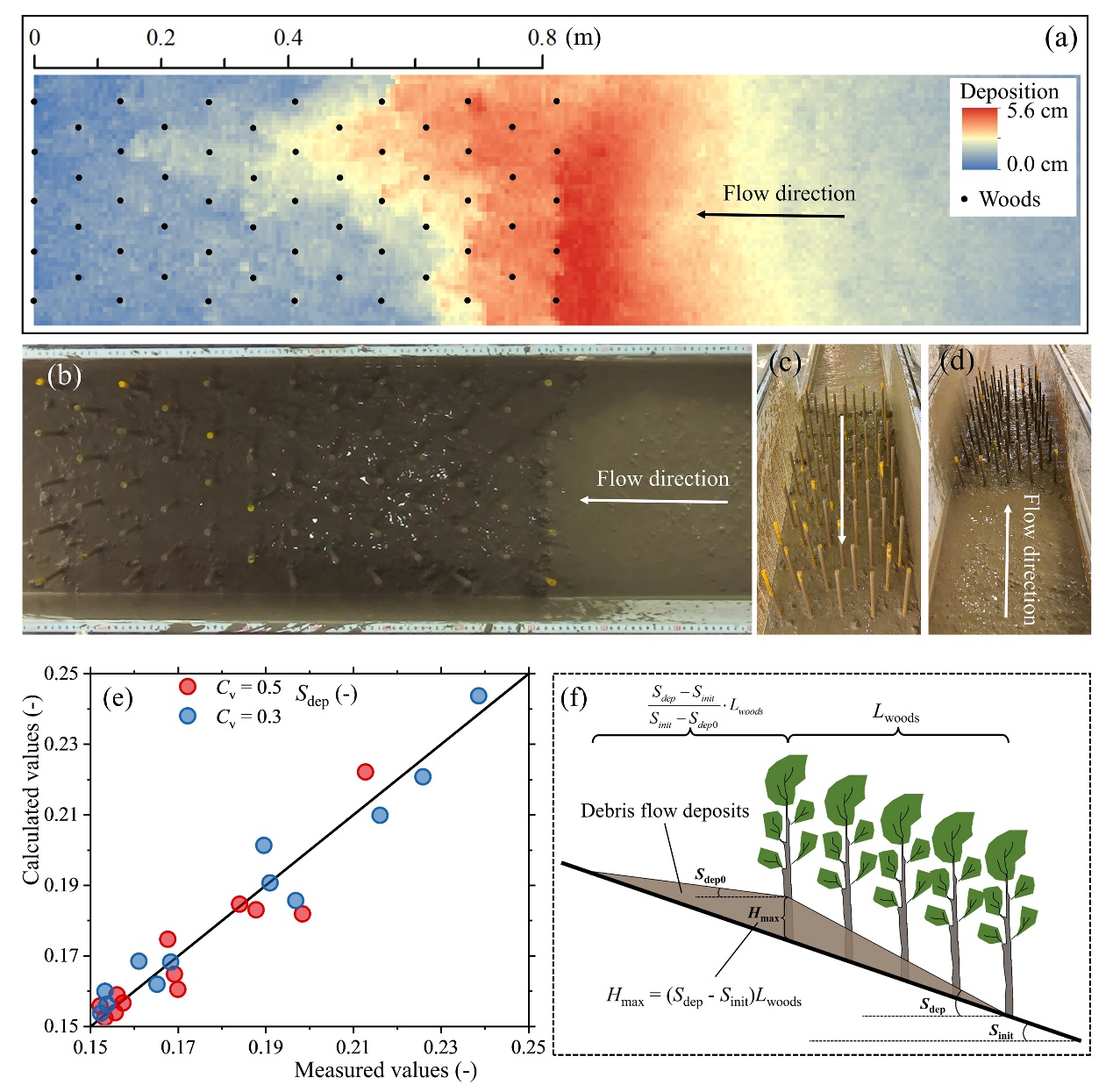 ????进而在沟道沟岸植被对泥石流冲淤过程调控方面,揭示了裸土沟岸退缩与泥石流侧向侵蚀互馈机制并构建了沟岸退缩参数化模型;阐明了泥石流作用下草本植物对沟岸侵蚀的调控机制,明确了沟岸侵蚀效率与草本植物特征参数间的关系;探明了沟道内乔木林对泥石流固体物质淤积效应的附加拦截机制,提出了考虑林带影响的泥石流淤积比降和淤积量计算方法。该研究初步构建了“拦砂坝淤积地貌-拦砂率-生物措施”之间的动态反馈模型,突破了防治工程减灾功效以传统静态评估为主的局限性,为泥石流防治工程减灾功效动态评估与运行维护提供理论依据。