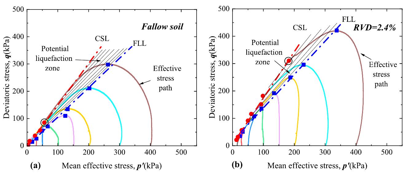 ????针对上述问题,研究团队构建了室内三轴剪切实验体系,选用杉树根系与砂土混合构造复合材料,设计了五级根系体积密度(0.8%400 kPa)组合,系统开展96组CD/CU路径三轴试验。结果表明:(1)根系形成土体内部“微纤维网”结构,显著提升峰值与残余抗剪强度;(2)在不排水条件下,有效抑制孔隙水压力积聚,使砂土脆性指数下降近50%,抗液化性能显著增强;(3)临界状态线整体随根密度抬升,且呈现应力路径依赖性,首次实验证实根-土复合体的临界状态行为受应力路径影响。