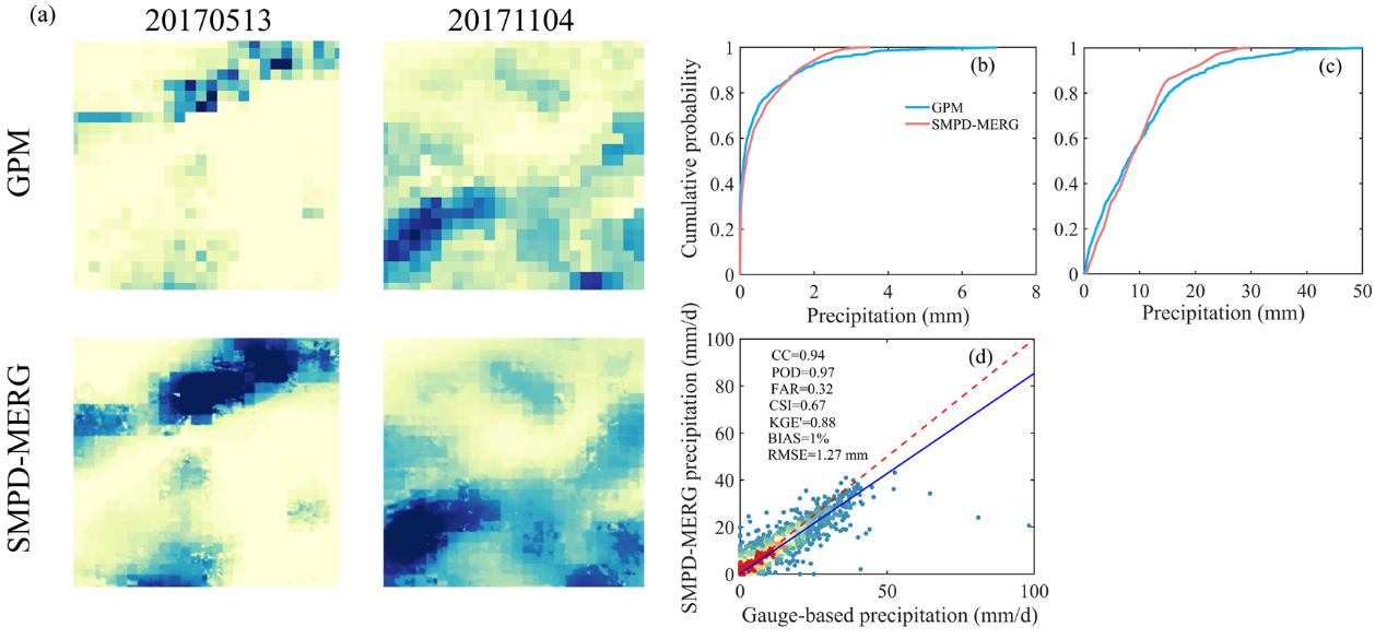 (a)旱季(20170513)和雨季(20171104)SMPD-MERG结果与原始GPM产品的空间分布对比。(b-c)旱季和雨季SMPD-MERG结果与原始GPM产品的累积概率比较。(d) SMPD-MERG结果与2016-2018年雨量计观测日降水的密度图