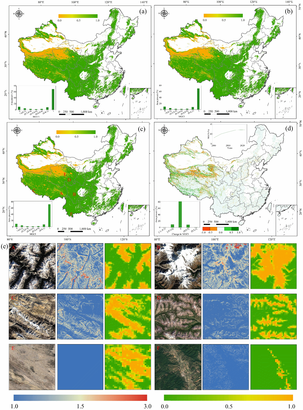 中国山地绿色覆盖指数时空分布(a,b,c分别为200020102022年指标估算结果,d为指标变化差异,e为局部细节特征)