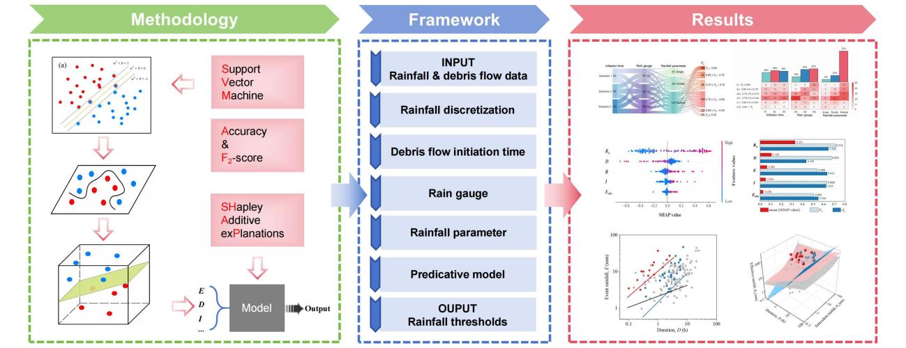 ????针对这一科学问题,成都山地所郭晓军研究员团队将人工智能方法创新性地引入小流域泥石流降雨阈值不确定性研究。该团队运用非线性高斯核支持向量机(NGK-SVM)筛选最优预测参数和流程,解决了传统统计方法难以捕捉降雨与泥石流关联的问题,并结合 SHapley 可解释性分析(SHAP)量化了各降雨参数对预报结果的贡献程度,评估各参数的重要性及其对结果的影响,克服了人工智能的 “黑箱” 困境。