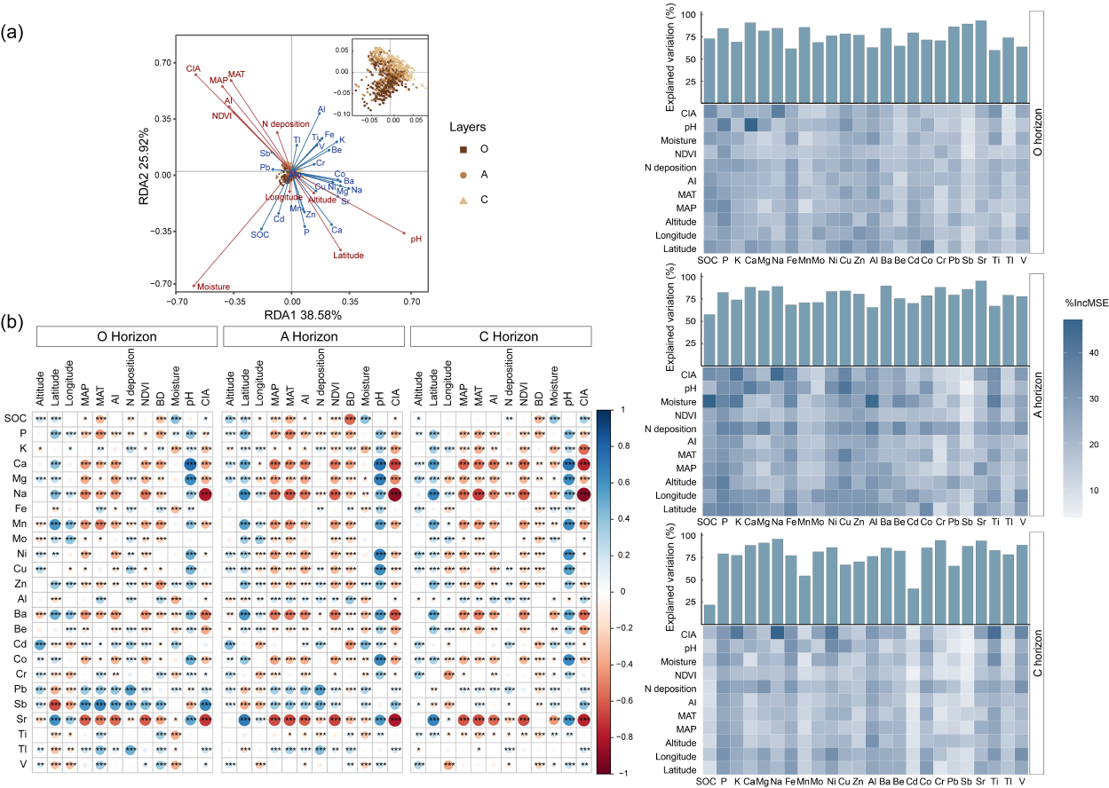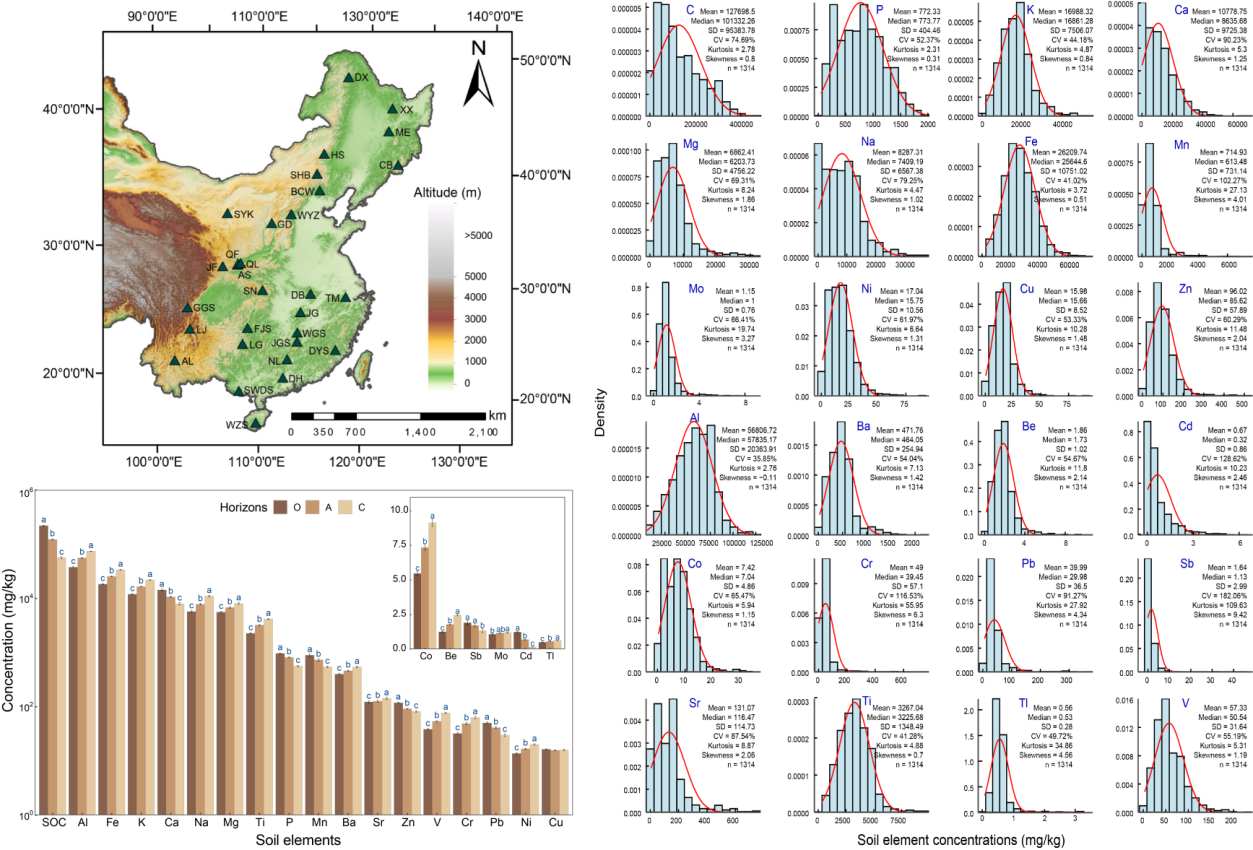 ????研究区横跨热带、亚热带、暖温带、温带和寒温带五大气候区,在 166 个样点、按照土壤发生层(有机层(O层)、表层矿质层(A层)和母质层(C层))采集了1300余份土壤样品。通过测定土壤中24种元素浓度(有机碳、磷、铝、钾、钙、镁、钠、铁、锰、钼、镍、铜、锌、钡、锶、钛、钒、钴、铍、镉、铬、铅、锑、铊)及主要理化属性(pH、含水率、容重),并整合气候、植被覆盖度、大气氮沉降、土壤类型和母质类型等环境因子,形成了一个覆盖范围广、信息维度高的山地土壤多元素数据集。该数据集为解析环境梯度下元素耦合关系、追踪养分与污染物迁移转化路径、改进地球生物地球化学模型以及评估生态系统服务与功能提供了坚实基础,具有广泛的应用前景,为山地生态系统的环境保护、生态保育和可持续管理提供了重要的数据支撑。