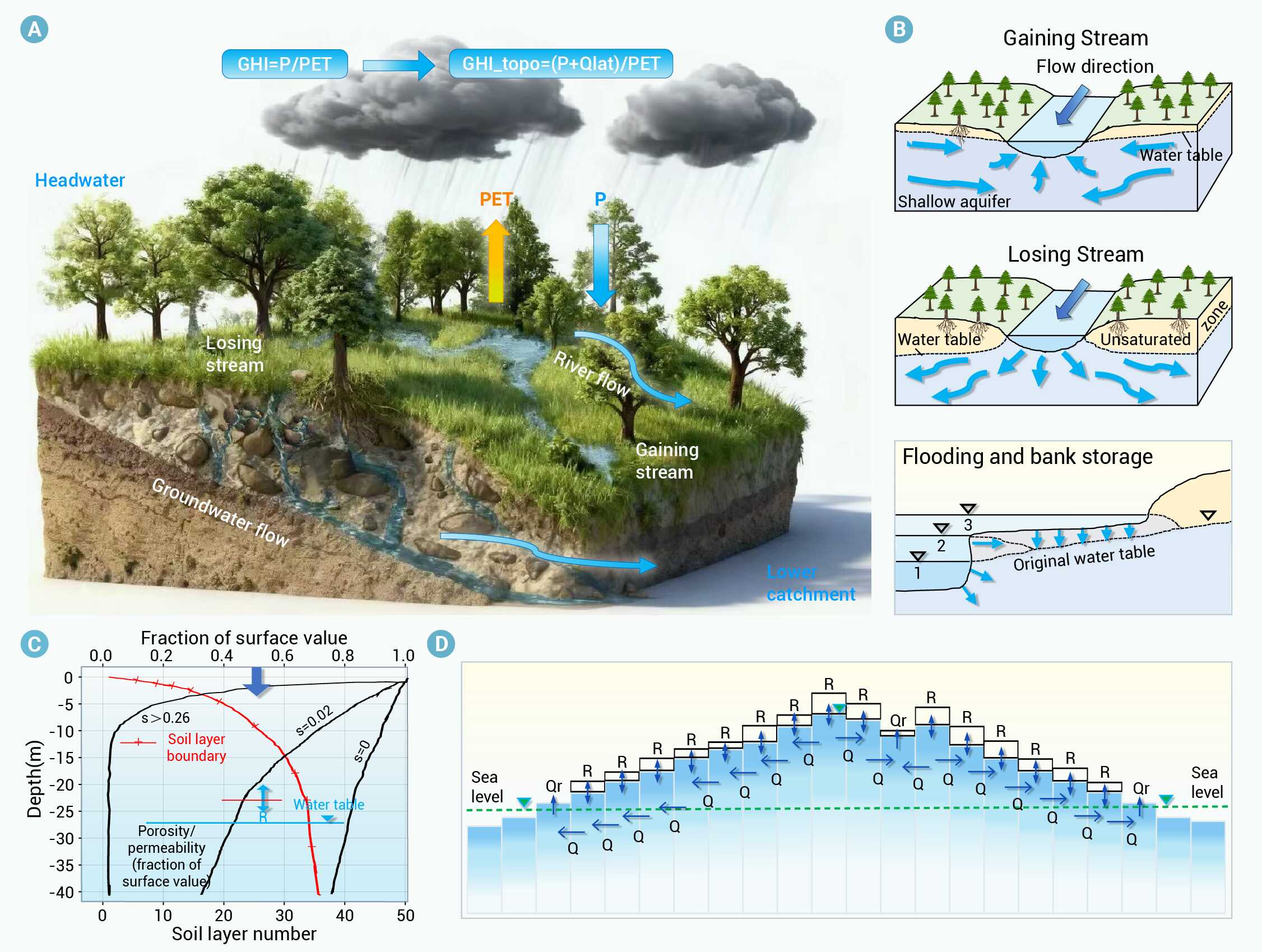 将侧向流补给(Qlat)纳入全球湿度指数(GHI)的概念框架:(A)侧向流路径示意;(B)土壤剖面深度与渗透特性;(C)地下水与河流-泛滥平原的双向交换;(D)高势地下水向低势侧向汇流,并在海平面边界条件下以河流形式排泄。