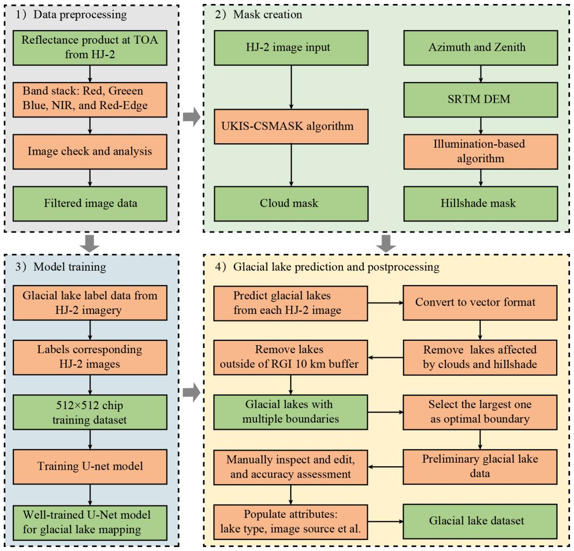 ????为应对上述挑战,中国科学院成都山地灾害与环境研究所聂勇研究员团队携手应急管理部国家减灾中心以及英国南极调查局的专家,基于国产环境减灾二号(HJ-2A/B)卫星数据,开发了一种依托高重访频率卫星影像的区域冰湖自动化制图技术。该研究充分利用 HJ-2A/B 卫星的高时间分辨率优势,将人工智能深度学习方法与遥感影像处理算法有机结合,成功实现了中喜马拉雅地区冰湖的高效遥感调查与动态监测。这一成果为破解高山复杂环境下冰湖监测的技术难题提供了新的解决方案。