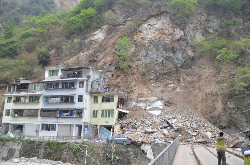 地震诱发山体滑坡毁坏民房