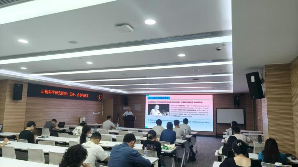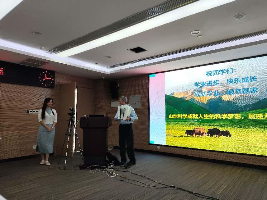 ????9 10 日,成都山地所开设的博士基础课、中国科学院大学数字精品课程 山地科学概论,邀请成都山地所原所长、四川师范大学教授、成都山地所特聘研究员邓伟,作《山地科学研究框架:任务、内容与体系》专题授课。邓伟研究员从 关于山地系统的基本概念、含义及理解“”山地:特定的地理空间“”山地研究的主要内容和进展“”山地表层系统研究的科学问题等方面,介绍山地科学的学科体系与结构、基础知识及前沿研究热点问题,通过分析亟待解决的问题,以开放式思考结尾,让同学们了解知识概况并引发思考??纬探嵛?,成都山地所向邓伟研究员送上鲜花与祝福。