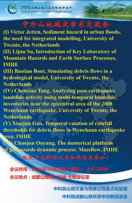 1028号,中科院山地灾害与地表过程重点实验室和成都山地所青促会小组举办中外山地减灾学术交流会,邀请荷兰Twente大学ITC/ESA系的系主任Victor Jetten教授(灾害风险评估)、博士生Bastian van den Bout(滑坡、泥石流数值模拟)和Chenxiao Tang博士(地震滑坡)以及来自台湾的陈昆廷博士与成都山地所苏立君研究员,欧阳朝军、郭晓军副研究员分别就双方在泥石流灾害启动机制、沟道侵蚀模型和动力学数值模拟研究进行了深入交流。
