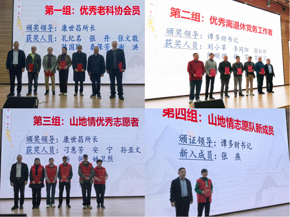 会议对2025年度离退休工作先进个人进行了表彰,授予7位同志“优秀老科协成员”、6位同志“优秀离退休党务工作者”和5位同志“山地情优秀志愿者”荣誉称号,充分肯定他们在建言献策、党建引领、志愿服务等方面的突出贡献,并为山地情志愿队新成员颁发了证书。