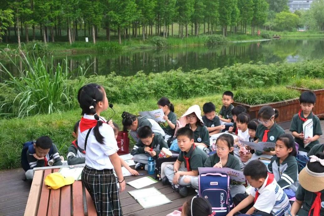????第二阶段是实地研学之旅,5月9日,二年级全体学生在鹿溪河公园开启了实地研学。同学们通过实地观察,学习了水生植物生存的智慧、乔木灌木的共生密码,以及垃圾分类的环保理念,更深刻地理解了湿地生态对净化水源、调节气候的重要性。