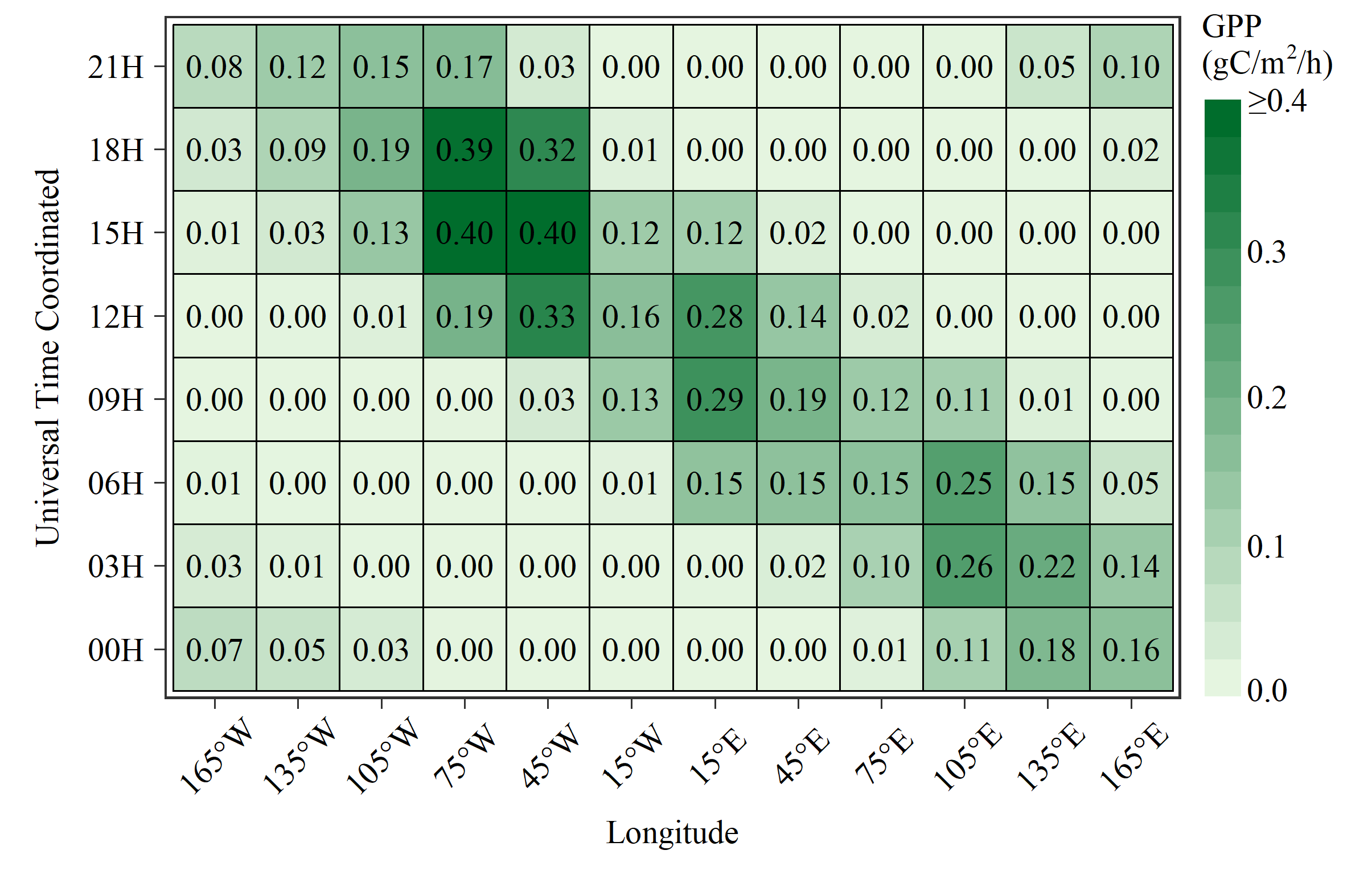 ????植被总初级生产力(GPP)是生态系统碳循环的关键参量,其精确估算对理解全球气候变化与陆地生态系统的相互作用至关重要。当前,全球GPP研究多聚焦于提升空间分辨率,但现有主流GPP产品的时间分辨率通?!?天,难以捕捉日间乃至小时尺度的生产力动态变化,限制了对生态系统快速响应环境胁迫机制的深入认识。为此,成都山地灾害与环境研究所山地地表过程智能监测与模拟团队应用RTL-LUE模型,融合多源遥感与再分析数据,成功研制并发布了全球长时序小时尺度植被GPP数据集。